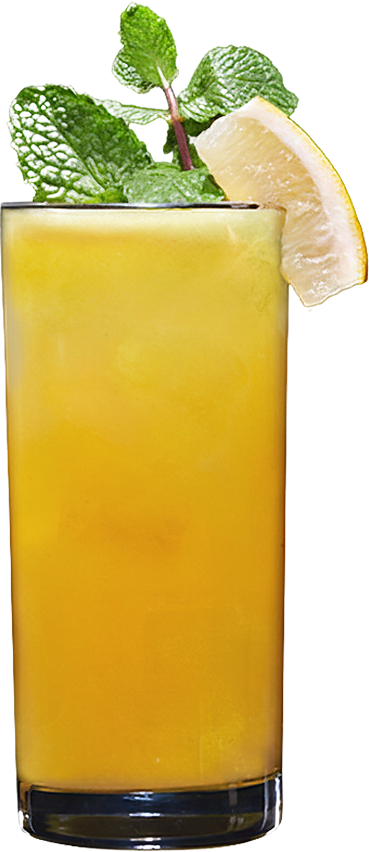 Garnish: A cut lemon wedge and a bouquet of mint.